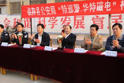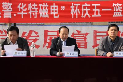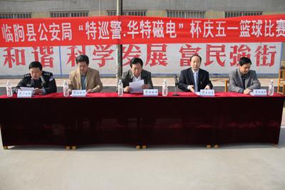 4月29日上午,由公司協辦的臨朐縣公安局“特巡警·華特磁電”杯慶五一籃球比賽在東城區吳家廟籃球場舉行。縣公安局政委張伯濤、縣公安局副局長楊維護,我公司董事長兼總經理王兆連出席開幕式。王兆連董事長在開幕式上講話,代表公司向大賽表示祝賀并祝籃球賽圓滿成功。