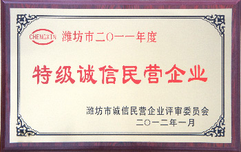 近日,公司被濰坊市誠信民營企業評審委員會授予“特級誠信民營企業”稱號。