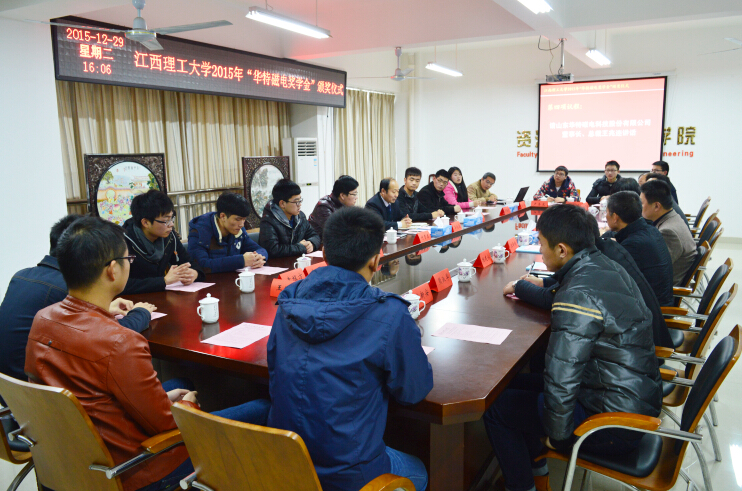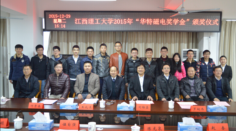 2015年12月29日,江西理工大學2015年度“華特獎學金”的在江西理工大學黃金校區(qū)逸夫實驗樓第一會議室舉行頒獎儀式,山東華特磁電科技股份有限公司董事長王兆連、濰坊新力超導磁電科技有限公司選礦實驗室主任付貴泰應邀出席,江西理工大學副校長伍自強教授、校團委書記、學工部副部長汪鋒鎖、研究生院院長助理陳龍泉、資環(huán)學院黨委書記楊建永、院長趙奎、院黨委副書記熊淑華、2015年度“華特磁電獎學金”的全體獲獎同學參加了本次儀式。