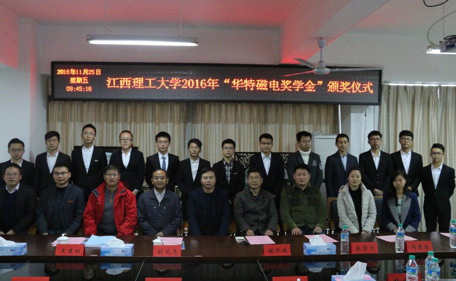 11月25日上午,2016年度“華特磁電獎學金”頒獎儀式在江西理工大學會議室隆重舉行。華特磁電公司常務副總裁劉風亮、綜合管理部經理王建功,江西理工大學副校長李國金、學生工作部副部長劉志剛等領導出席頒獎儀式。