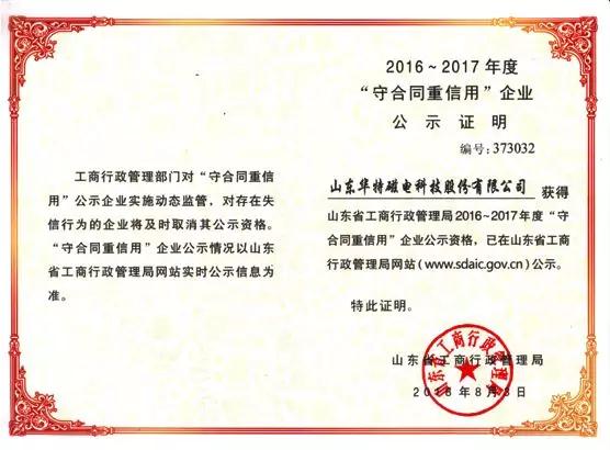 山東華特磁電科技股份有限公司被認定為2016-2017年度山東省守合同重信用企業