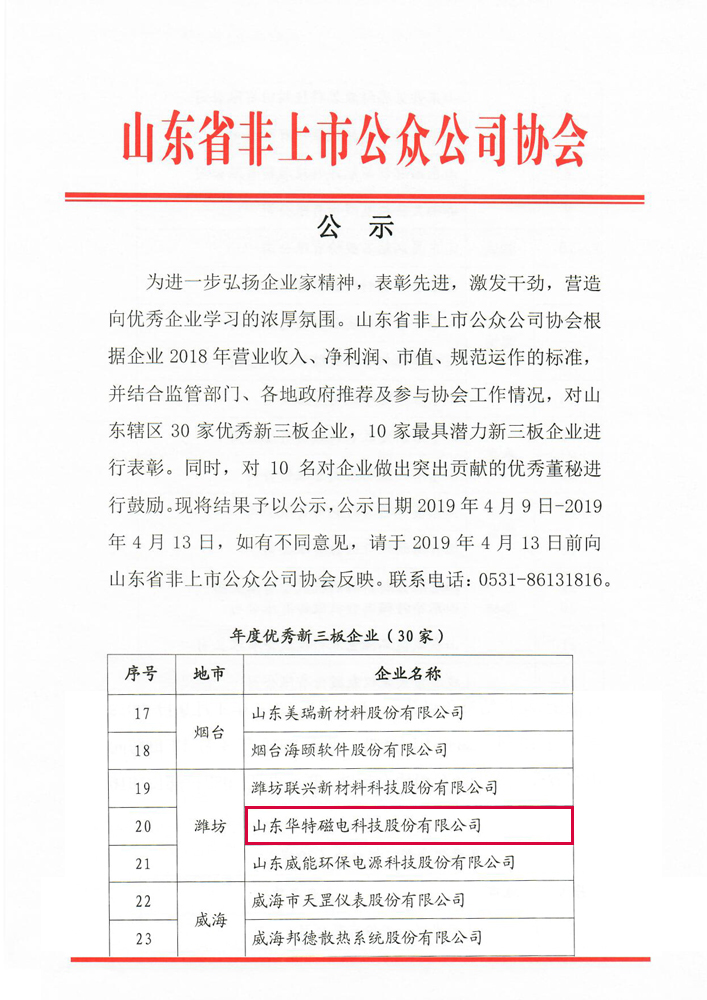 本次會議根據(jù)企業(yè)2018年度營業(yè)收入、凈利潤、市值、規(guī)范運(yùn)作的標(biāo)準(zhǔn),并結(jié)合監(jiān)管部門、各地政府推薦及參與協(xié)會工作情況,對山東轄區(qū)30家優(yōu)秀新三板企業(yè),10家最具潛力新三板企業(yè)進(jìn)行了表彰。華特公司在全省五百多家新三板企業(yè)中脫穎而出,榮獲“2018年度優(yōu)秀新三板公司”稱號。