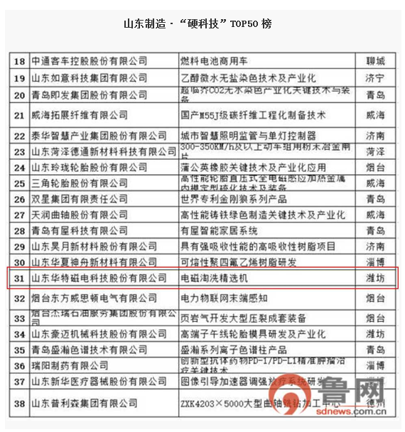 2019年5月23日上午,以“科技鑄就品牌之魂 創(chuàng)新推動(dòng)高端發(fā)展”為主題的制造業(yè)高質(zhì)量發(fā)展2019山東論壇暨山東制造?硬科技TOP50品牌榜發(fā)布儀式在濟(jì)南市南郊賓館舉行。華特公司“電磁淘洗精選機(jī)”產(chǎn)品成功入圍“2019山東制造?硬科技Top50品牌榜”,公司常務(wù)副總劉風(fēng)亮出席會(huì)議并領(lǐng)取獎(jiǎng)杯。