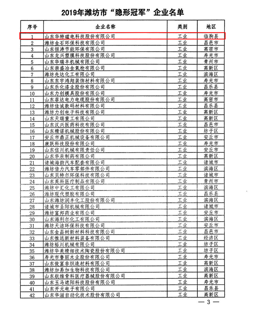 【喜訊】 山東華特磁電被認定為2019年度濰坊市隱形冠軍企業