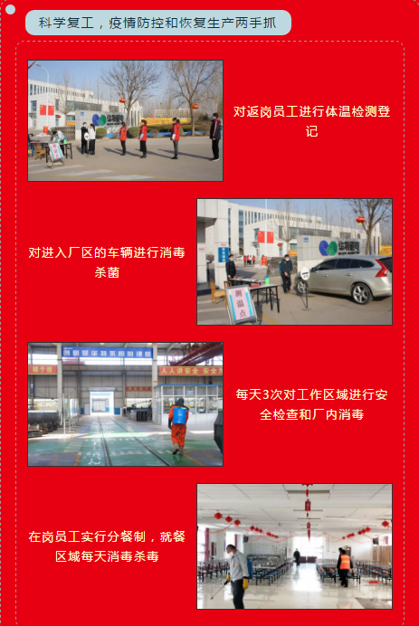 為了深入貫徹和落實上級黨委政府有關組織企業復工復產的決策部署,華特公司積極響應、迅速行動,在確保疫情防控安全的前提下,第一時間開展復工員工防疫核查管控,多渠道加大疫情宣傳力度,緊急籌備疫情防控物資質,建立疫情防控架構和機制,開展工廠各區域全面防疫消毒、滅菌消殺處理以及提交復工復產申請材料等各項準備工作,確保公司所有的疫情防護措施做到位,全方面保障員工復工后的身體安全。目前,在城關街辦、縣經信局及縣委縣政府的大力支持和指導下,經臨朐縣新型冠狀病毒感染肺炎防控領導小組(指揮部)辦公室連夜批復,公司順利通過兩級復產驗收,如期按計劃復工復產。