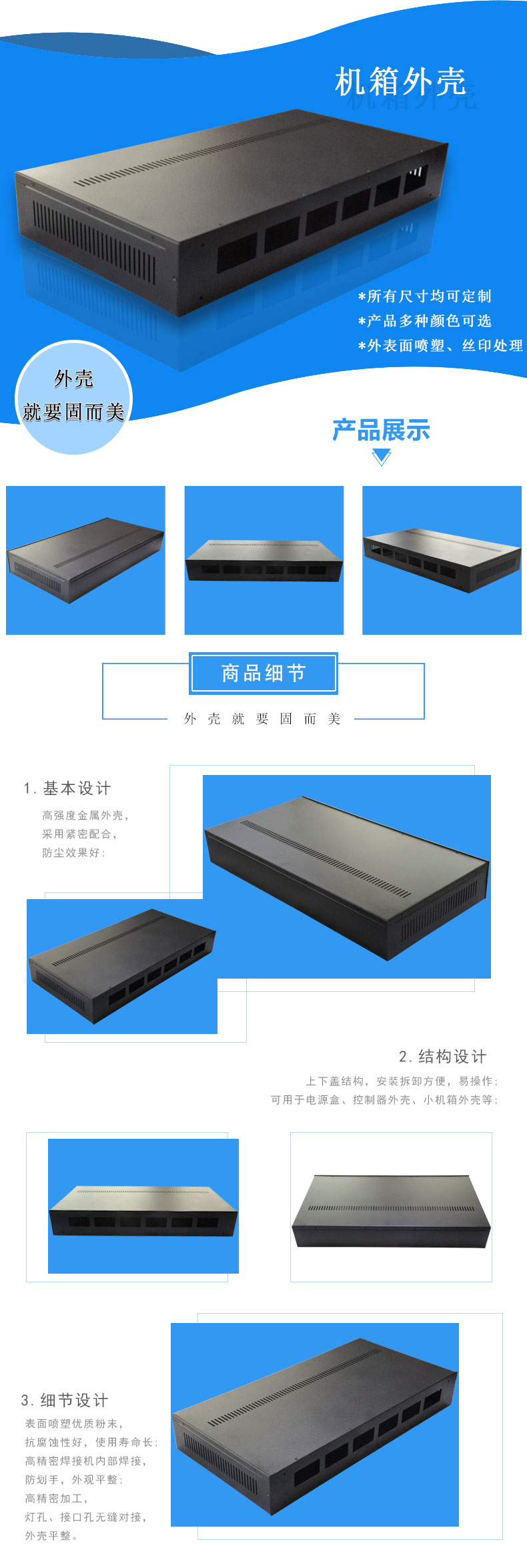 * 此款外殼適用于機箱外殼,工控服務機箱外殼,非標金屬機箱外殼定做,大機箱外殼來圖來樣設計。 * 產品材料:鍍鋅板 * 盒體采用開孔合理,免工具安裝 * 表面可噴塑,絲印 * 產品顏色和材料批量可訂制 * 所有尺寸均可按要求修改