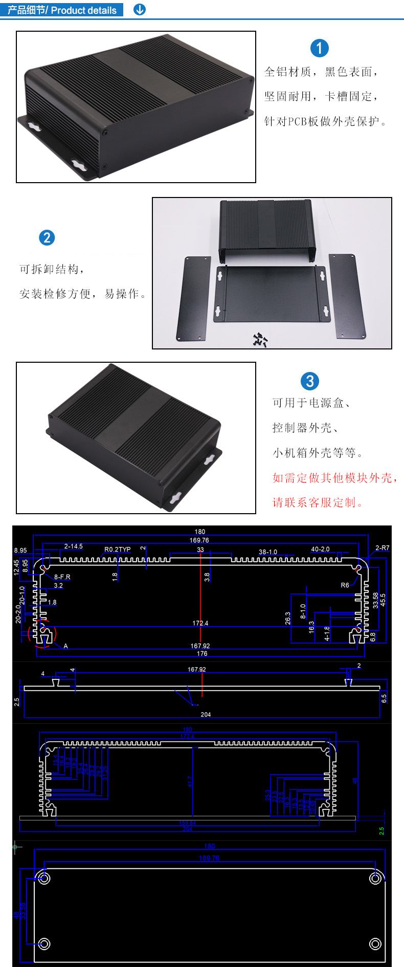 特點(diǎn):1.全鋁材質(zhì),黑色表面,堅(jiān)固耐用,卡槽固定,針對(duì)PCB板做外殼保護(hù)。