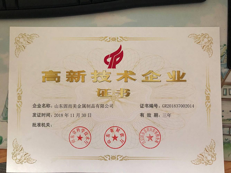 山東固而美金屬制品有限公司喜獲“國家高新技術(shù)企業(yè)”認證證書,標(biāo)志著山東固而美正式邁入“國家級高企”序列。