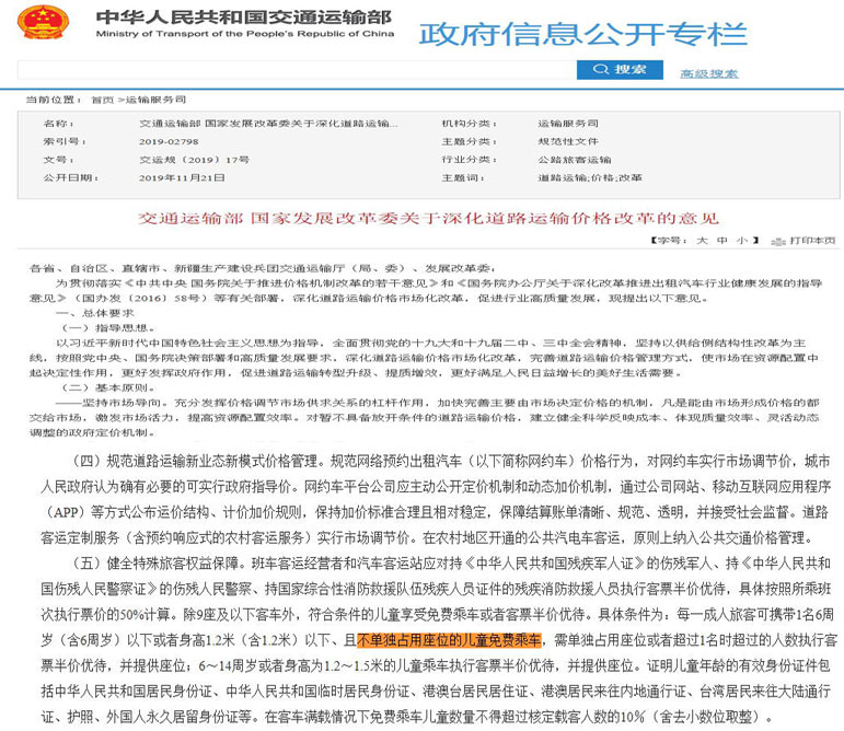 11月21日電(李金磊)交通運輸部會同國家發(fā)改委21日印發(fā)《關于深化道路運輸價格改革的意見》,明確符合條件的兒童乘坐客運班車享受免費乘車或者客票半價優(yōu)待。在兒童身高標準基礎上,增加以年齡為依據(jù)的兒童票、免票劃分標準。