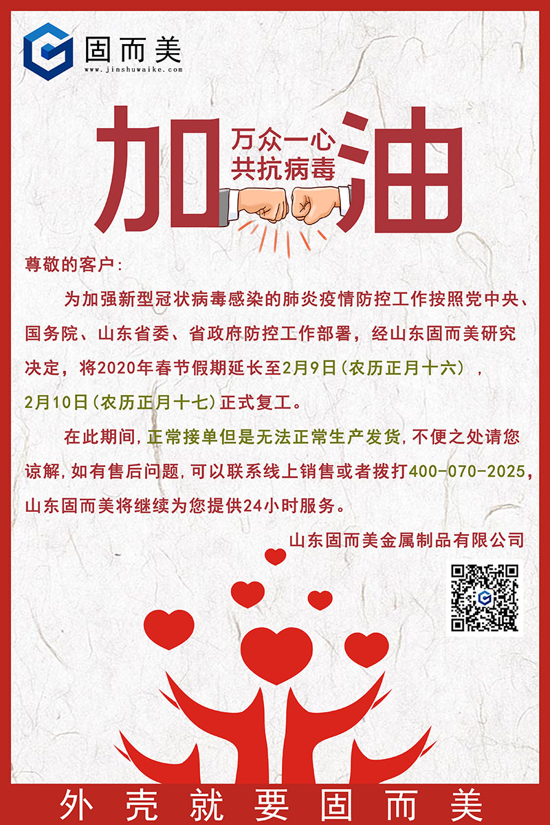 為加強(qiáng)新型冠狀病毒感染的肺炎疫情防控工作按照黨中央、國(guó)務(wù)院、山東省委、省政府防控工作部署,經(jīng)山東固而美研究決定,將2020年春節(jié)假期延長(zhǎng)至2月9日(農(nóng)歷正月十六) , 2月10日(農(nóng)歷正月十七)正式復(fù)工。